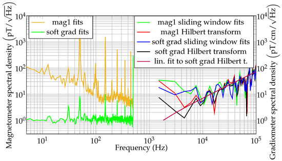 After notch-filtering the photodiode signal, the instantaneous frequency (IF) at a sample rate of is computed using the Hilbert transform. The IF is converted to magnetic field units; thus, the instantaneous magnetic field is obtained. The ANSD of the first magnetometer channel is shown in red in Figure 8, together with the ANSD estimated from sliding window fit magnetic field readings. It should be noted that the low frequency information of the magnetometer spectral density for the high sample rate magnetic field estimations is limited to the lower kHz range. This is due to the repetition rate of the pulsed magnetometer; i.e., in a single cycle only of data are available, limiting the content of low frequency information. It can be observed that the Hilbert transform and sliding window noise floors match. Additionally, in Figure 8 the gradiometer noise spectral density as calculated by various methods is shown. Please note that the theoretical noise increases linearly with the frequency above . A linear fit to the gradiometric noise spectral density as obtained from the Hilbert transform data is shown in purple in Figure 8. This linear noise increase is typical for free precession decay magnetometers [36], but can also be found in Mx-magnetometers [58]. This can be explained considering Equation (6). The varying magnetic field, e.g., , contributes with its integral to the phase . Therefore, the amplitude of the oscillating part of the phase decreases with . This decrease is reverted when calculating the phase derivative for obtaining the instantaneous frequency. However, the general system phase noise is white, which is converted to a linearly increasing magnetic field noise floor due to the derivative [36,59]. Note that the magnetometer noise approaches the gradiometer noise for high frequency data, in part due to the decreasing ambient magnetic noise for high frequencies. The observed magnetometer noise floor for unshielded measurements at with a magnetic field sample rate of was about , while was obtained for the gradiometer. The observed suppression ratio of the environmental 50 Hz noise by the software gradiometer was about 176, as can be observed in Figure 7. Further investigations are needed to assess the noise contributions and suppression performance at higher frequencies (Figure 8).