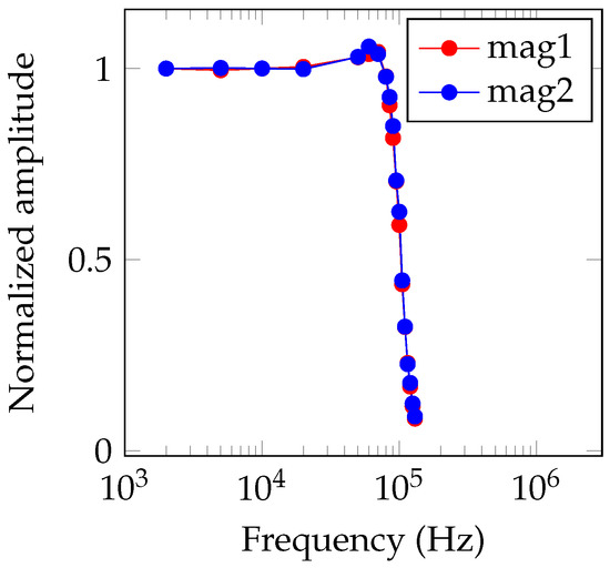 Next, the bandwidth of the OMG in an unshielded environment was estimated by applying a sinusoidally modulated magnetic field with an amplitude in the same direction as the background magnetic field. From the bandpass-filtered photodiode signal, the instantaneous magnetic field is calculated using Hilbert transform and the result is lowpass-filtered. Then, a sine wave with fixed frequency (but unknown amplitude and phase) is fitted. The estimated amplitude response is shown in Figure 9 and the estimated bandwidth is , limited by the applied lowpass-filter. The filter’s stop frequency is selected arbitrary and can be increased or decreased, depending on the application (compare also [36]). However, like elaborated before, the increase of the noise floor proportional to the frequency needs to be considered in practical applications.