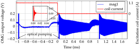 In MRX, the sensor dead time after switching off of the excitation coil is a critical parameter. Figure 10 shows the coil current and the photodiode signal of the magnetometer channel close to the excitation coil. It takes approximately from the start of the coil switch-off to the end of the OMG’s pumping period. Together with the of data discarded during data analysis this results in a system dead time of . Therefore, the limits are both, the switch-off and ringing-time of the excitation coil, and the data analysis.