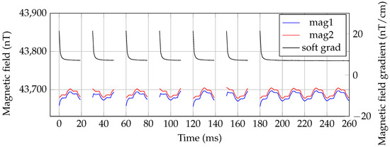 This procedure is repeated for the second magnetometer channel. The difference of the obtained magnetometer signals is divided by the baseline () to obtain the first order gradiometric signal.