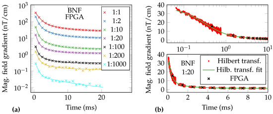 Unshielded OPM-MRX measurements of a BNF-MNP dilution series. The excitation coil was switched off a few before the timestamp . The gradiometric data were averaged 100-times and an averaged empty measurement was subtracted. Individual FPGA-data-points are indicated by crosses, solid lines are the corresponding exponential fits (compare Table 1). (a) FPGA data. (b) FPGA data and instantaneous magnetic field obtained via Hilbert transform of 1:20 BNF sample; top: logarithmical time axis, bottom: linear time-axis.