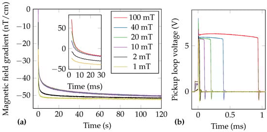 The gradiometric FPGA data of MNP’s embedded in gypsum is shown in Figure 13a. During this experiment, the unshielded gradiometric noise floor was about . The FPGA data were not averaged or filtered. No empty measurements were subtracted, as the gradient is larger than the effects from the excitation coil. Therefore, subtracting non-Mains-synchronized data would result in a slight degradation of the data. The first valid data point is after initiating the excitation coil switch-off. The excitation coil ringing in the first gradiometer sample is less than . The visible static gradient of ≈ nT/cm corresponds to the superposition of the MNP sample’s remanence magnetization and the static gradient in the laboratory environment of . On the large time-scale it can be observed that the MNP are saturated for excitation fields , which was also observed in SQUID-MRX measurements of the same sample. The estimated relaxation parameters are summarized in Table 2. We would like to mention that a similar non-monotonous effect of the relaxation parameters was observed for Brownian relaxation in [62].