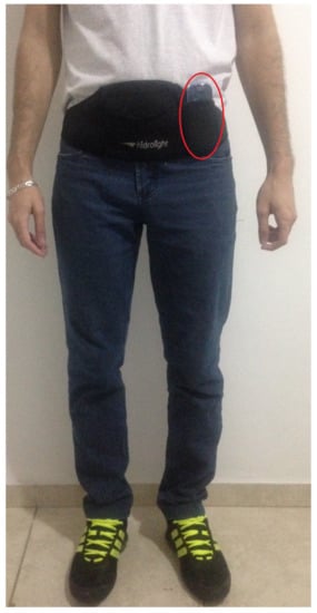 Each participant received a smartphone placed inside a waistband, as shown in Figure 1. The participants were instructed to naturally execute each movement condition without receiving any stimulus or corrections during it, all situations were performed inside our laboratory, without a pre-defined route. The smartphone accelerometer generated the gravity acceleration data at a rate of 20 Hz, with a range of ±2 g, and the 3 axes information were stored on the smartphone together with the timestamp. The smartphone chosen was a 1 GHz processor, 1 GB RAM, Android OS 4.1.2, i.e., with severe resource limitations.