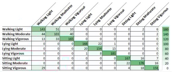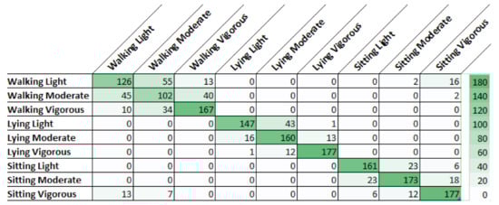 Regarding the low accuracy of walking activity observed in Table 1, also shown in Table 2, we suspect that it is caused by the participant’s physical parameters variabilities, such as height, weight, and even the interpretation given by the participant to the fuzzy terms inherent to the intensity. The impact of these personal parameters was not the focus of this research and should be investigated better.