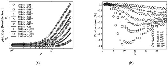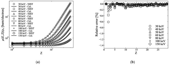 (a) (solid line) from 30 keV to 150 keV of atomic numbers up to 29, calculated via three-PFM using Equation (10), and corresponding NIST values (marker), (b) relative errors between calculated and NIST values in (a).