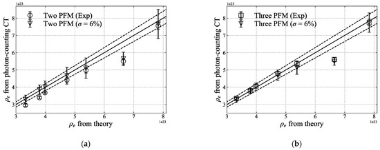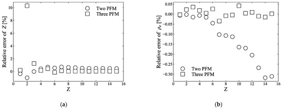 (a) shows the relative errors of the atomic number calculated via two-PFM using Equation (8) and three-PFM using Equation (12), respectively, compared to the theoretical values, and (b) shows the relative errors of the electron density calculated via two-PFM using Equation (9) and three-PFM using Equation (13), respectively, compared to the theoretical values.
