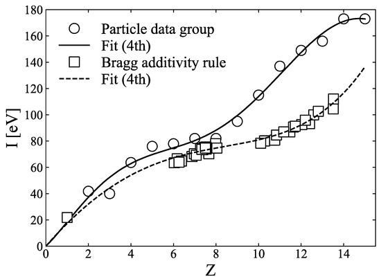 In this study, the theoretical I-values of the elements were obtained from the Particle Data Group (PDG) database [28], which refers to ICRU Report 37 [29], and those of the mixtures were calculated using Equation (15).