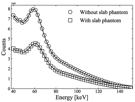Spectra measured using CdTe line-sensor array, without and with 30 mm-thick slab phantom. Solid lines were calculated using the cubic spline interpolation method.