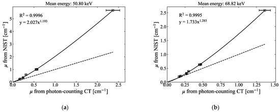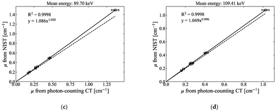 Linear attenuation coefficients obtained from photon-counting CT and those calculated using Equation (17) from NIST values for (a) threshold one, (b) threshold two, (c) threshold three, and (d) threshold four. Solid lines are results of fitting to a power function, and broken lines indicate the same values for x- and y-axes (Slope = 1). Mean energy was calculated using Equation (16).