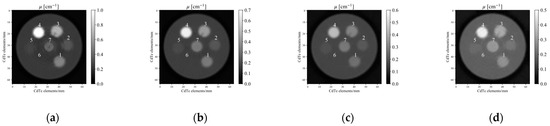 Figure 9 and Figure 10 compare the effective atomic numbers, electron densities, I-values, and SPRs calculated using two-PFM and three-PFM, respectively, using each of the four images obtained in Figure 8. The ring artefact in Figure 8 is reflected in the calculated image. For the effective atomic number, the centre parts of the sample holder in Figure 9a and Figure 10a have incorrectly calculated parts because of the ring artefacts seen at the centre parts of the images of thresholds 1 and 4 in Figure 8a,d. The I-values in Figure 9c and Figure 10c were converted from the effective atomic numbers in Figure 9a and Figure 10a, respectively, via fourth-order polynomial fitting of Figure 4 calculated using the Bragg additivity rule. The SPRs of Figure 9d and Figure 10d were then calculated from electron density (b) and I-value (c) of Figure 9 and Figure 10.