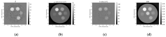 Maps calculated via two-PFM for (a) effective atomic number, (b) electron density, (c) I-value, and (d) SPR. The I-values were parameterised using the fitting curve of the mixture in Figure 4, calculated using the Bragg additivity rule.