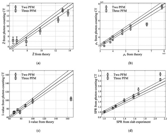 Comparison of (a) effective atomic number, (b) electron density, (c) I-value, and (d) SPR calculated via two-PFM and three-PFM with theoretical values. Solid lines indicate the same values for x- and y-axes, and the dotted line represents the error level of 5% for the solid line. Standard deviations are plotted together for each value. For the values here, regions of interest (ROIs) were set corresponding to the size of each rod sample in Figure 9 and Figure 10, and the mean and standard deviation were calculated.