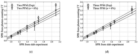 Comparison of experimentally obtained electron density (Figure 11b) and theoretically calculated electron density via (a) two-PFM and (b) three-PFM, and of experimentally obtained SPR (Figure 11d) and theoretically calculated SPR via (c) two-PFM and (d) three-PFM. The theoretical values were calculated by adding a 6% noise level to each linear attenuation coefficient from four different thresholds. Solid lines indicate the same values for x- and y-axes, and the dotted line represents the error level of 5% for the solid line. Standard deviations are plotted together for each value.