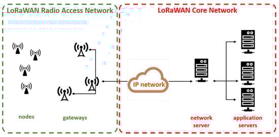 Figure 2) consists on a star-of-stars topology where one or more gateways (concentrators) relay download and upload traffic between a variety of end-nodes (that may be either mobile or mounted at a fixed location) and a central network server respectively. The network server manages the traffic between each end-device and the associated application server. The communication between end-devices and gateways consists of single-hop LoRa or FSK connections, whereas gateways make use of standard IP connections to the network server. All the communications are bi-directional.