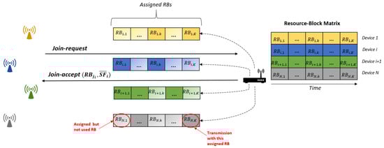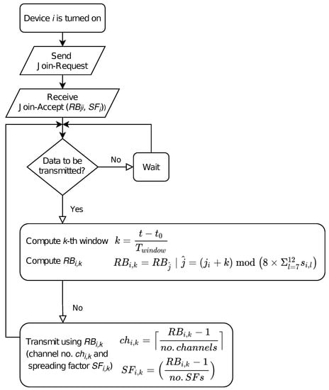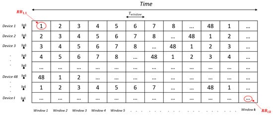 Taking into account that the ISM frequency band in Europe allows up to 8 LoRa 125 KHz channels configuration and there are 6 different spreading factors, there are a total of 48 orthogonal resource blocks . Without loss of generality, we assume that the first 6th resource blocks utilize the first channel and spreading factors from 7 to 12, the second 6th RBs utilize the second channel and spreading factors from 7 to 12, and so on. Each node will divide the time in windows with a duration of . If node i transmits during the k-th window, that is, , it will utilize a specific resource block .