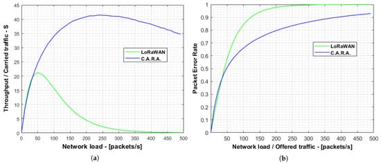 Comparison of the throughput and PER for 50,000 devices between a standard LoRaWAN network and using CARA. (a) System throughput and (b) Packet Error Rate.