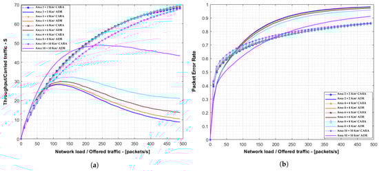 Throughput and PER for 1000 devices in the case of non groups of SF with different area dimensions. (a) Mean throughput of the system for ADR and CARA cases. (b) Packet Error Rate of the system in ADR and CARA cases.