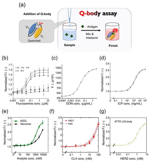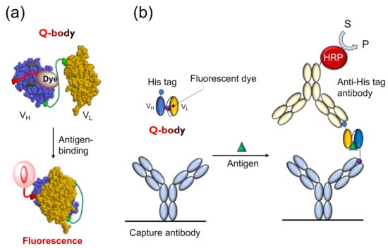 The Q-body is an antibody-based immunosensor, most frequently constructed by labeling the N-terminal region of scFv or the antigen-binding fragment (Fab) of an antibody with a fluorescent dye. The structure and working principle of a Q-body are shown in Figure 1a. When a specific fluorescent dye such as tetramethylrhodamine (TAMRA), rhodamine 6G (R6G), and ATTO520 is attached near the N-terminus of an antibody with a short (4~25 aa) flexible linker peptide, the fluorescent dye enters the variable regions of the antibody (Fv; VH + VL) due to the dye’s hydrophobicity. Specific amino acids, namely, several tryptophan (Trp) residues in the antibody variable region weaken the fluorescence of the dye by fluorescence quenching due to photoinduced electron transfer (PET) from Trp to the dye []. In general, when the fluorescent dye is illuminated with the excitation light, the electrons transition from a low-energy orbit to a high-energy orbit, and emit fluorescence when these return to their low-energy orbit. However, in the vicinity of an amino acid that can provide electrons, the fluorescent dye takes electrons from the amino acid and does not emit fluorescence, termed as fluorescence quenching. However, when the Q-body binds to an antigen, due to antigen-dependent Fv stabilization and steric hindrance due to bound antigen, the quenched dye can no longer dwell in the interior of the antibody and moves to the exterior, and recovers its fluorescence. The antigen concentration can thus be detected by measuring the positive change in fluorescence intensity. This technique is easy to operate by simply adding the sample to the probe solution, by measuring the fluorescence intensity in a few seconds to minutes.