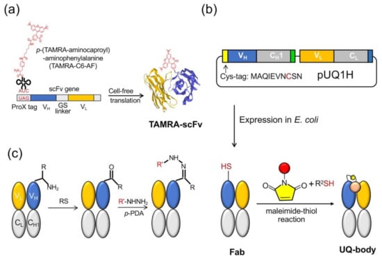 The Q-body was first discovered accidentally when scFv was specifically labeled with fluorescent dye-conjugated aminoacyl tRNA using cell-free translation technology []. The early Q-bodies were mainly designed based on the scFv or Fab format and synthesized by cell-free translation technology (Figure 2a). Abe et al. later reported that Fab fragments can be expressed by prokaryotic cells, and that the reaction of cysteine and maleimide can be used to label antibody fragments for preparing an ultra-Q-body (UQ-body) (Figure 2b). The UQ-body is more stable and generally gives higher sensitivity than the scFv type Q-body, probably due to deeper quenching [].