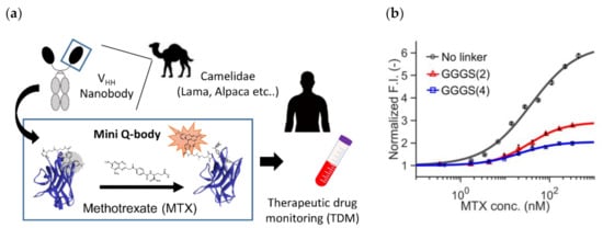 Recently, Inoue et al. reported the successful construction of a Q-body that can detect a small molecule methotrexate (MTX) using a specific VHH fragment []. MTX is known as a specific inhibitor of mammalian dihydroforate reductase (DHFR), which participates in nucleic acid metabolism. Hence, it has been used as a chemotherapeutic agent against cancer. However, as normal cells also have DHFR, higher doses might lead to the risk of side effects. In addition, MTX is known to have immunosuppressive activity, and its effective dose is low. Hence, monitoring its blood concentration (therapeutic drug monitoring, TDM) is considered very important (Figure 5a).