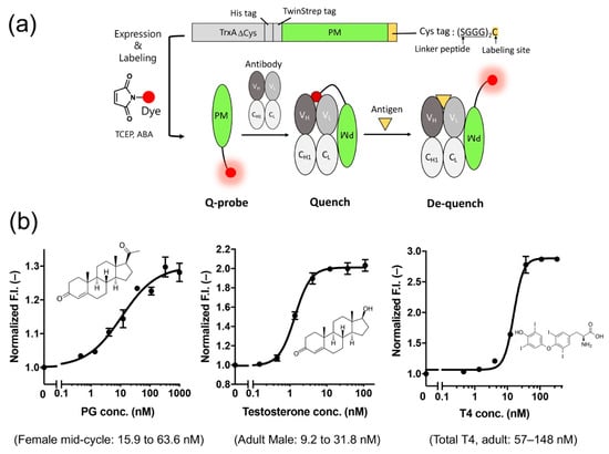 Recently, we developed a probe (PM Q-probe) that can easily convert many antibodies, including commercially available ones, into fluorescent biosensors using a recently discovered antibody-binding protein Protein M (PM) []. The PM, isolated from human mycoplasma, was found to bind strongly (Kd~low nM) to a wide range of antibodies at the light chain, and is considered to disrupt the immune system by structurally blocking the binding of antibodies to (protein) antigens []. We found that the C-terminal region of PM is close to the antigen-binding site of the antibody in the solved structures, and hypothesized that binding of smaller antigens such as peptides and haptens is not interfered by the PM upon binding. Thus, we constructed a probe containing a dye introduced into the C-terminus of PM via a short linker and named it PM Q-probe (Figure 6a). This Q-probe was found to have properties similar to Q-bodies, as its fluorescence was quenched by 50% when mixed with osteocalcin-recognizing antibody Fab fragments or full-length IgG antibodies, which are bone disease markers that were used as models, and its fluorescence was restored when osteocalcin or its C-terminal fragment was added as the antigen. Interestingly, the complex with IgG showed higher antigen detection sensitivity than the recombinantly constructed Fab. It is worth noting that the full-length osteocalcin (49 aa) was also detected by Q-probe/Fab complex with similar sensitivity to the scFv BGP Q-body, suggesting that not only small molecule but also small proteins are detectable by PM Q-probe.