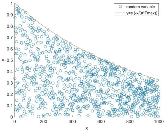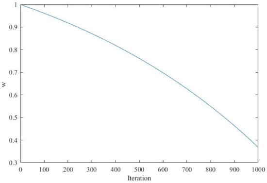 where is the current iteration times; represents the maximum iteration times; is an inertia weight that adaptively decreases as the number of iterations increases. By introducing this inertia weight, the range of values taken by is adaptively controlled. As is shown in Figure 2, at the beginning of the iterations, a larger value of gives the algorithm a larger range of optimization. At the end of the iterations, a smaller value of is conducive to enhancing the convergence accuracy of the algorithm.