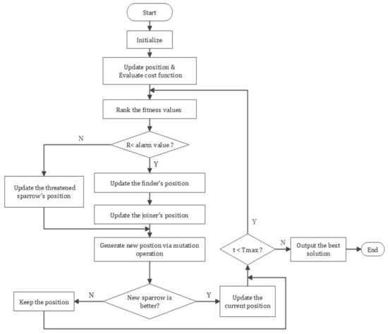 where represents the current iteration; is the number of sparrows; denotes the dimension of the variables; is the largest number of the iteration; represents the position of the ith individual at iteration t; denotes a random number; represents the alarm value and represents the safety threshold; is a matrix that each factor inside is 1; is a random number that obeys the normal distribution with mean 0 and variance 1; if , it denotes that the foraging environment is safe, while signifies that some individuals have already encountered predators and therefore all sparrows need to fly quickly to other safe areas.