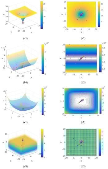 The trajectories of CASSA on the 3-D version of the four test functions: (a1,a2) Ackley function; (b1,b2) Cigar function; (c1,c2) Schwefel function; (d1,d2) Weierstrass function.
