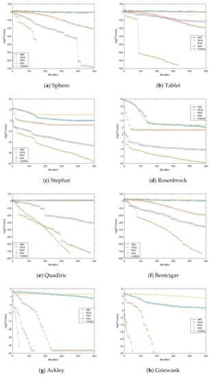 In this section, there are four tested functions shown in Table 2, and the trajectories of individuals of CASSA in these test functions are presented in Figure 4. It shows that most individuals move towards the global optimum in unimodal functions. However, in the more complex multi-modal functions, although many individuals stagnate at the local minimums, some individuals can still avoid them and aggregate towards the global optimum. To verify whether it is feasible and highly efficient, the proposed CASSA is compared with four algorithms in the experiments, including original SSA, PSO, ABC, and WOA. There are twelve classical benchmark functions [37] shown in Table 3, which consists of the information of their formula, initialization range, and global optimum. Among these benchmark functions, f1∼f6 are unimodal functions, and f7∼f12 are multi-modal functions. In all cases, we conducted the independent trials 30 times on each benchmark function. The maximum number of iterations is 500, and the population size is 50 in each experiment. Finally, we obtained the best value, mean value, and the standard deviation (Std.) of the objective function values. With the same benchmark function, the best value and average value denote the exploration ability and convergence accuracy, respectively, and the standard deviation denotes the stability of the algorithm. The experimental results are shown in Figure 5 and Table 4.
