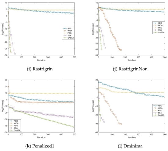 As is shown in Figure 5, in the experiments on unimodal functions, CASSA can quickly find the optimal values of f1, f2, f5, and f6. Although the optimal values of f3 and f4 are not found, CASSA still has the fastest convergence speed and accuracy among all the tested algorithms. In the experiments on the multi-modal functions, only CASSA and SSA can find the optimal values of f7. For f8, f9, f10, and f12, CASSA, SSA, and WOA can find the optimal values, but CASSA requires the smallest iteration times. For f11, all algorithms fail to find the optimal value, but CASSA still finds the near-optimal solution with the highest accuracy.