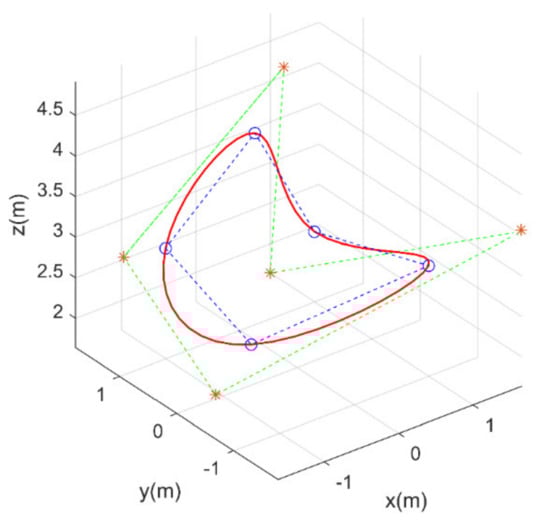 The B-Spline curve is used to determine the flight route, and it has the advantage of illustrating a complex non-monotonic 3d curve with controlled smoothness through a few designed parameters. Figure 6 shows a 3d cubic B-Spline curve (k = 3) with its control points and the corresponding control polygon (the green line). After this procedure, the original route (the blue line) could be replaced by the new smooth route (the red curve).