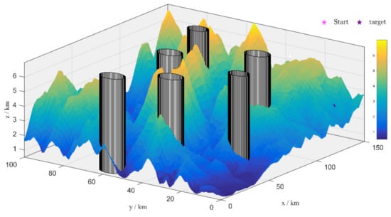 The UAV mission region is [0, 150] km long, [0, 100] km wide, and [0, 8] km high, and UAV knows the terrain and threat’s position. The terrain is modeled by a processing elevation map of real terrain, while the threats are modeled as black columns. The coordinates value of the start point is (10.0,90.0,2.3 km), the coordinates value of the target point is (140.0,10.0,2.9 km). The 3d UAV route planning environment is shown in Figure 8.