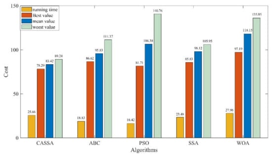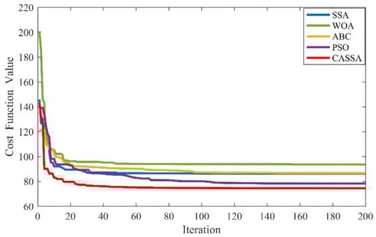 In terms of convergence value and convergence speed, CASSA is better than the other four test algorithms. As is shown in Table 4, the test results of unimodal functions and multi-modal functions show that the mean and variance of CASSA are much smaller than those of the other four algorithms, which shows that the optimal values obtained by the algorithm are highly stable and robust and can be effectively implemented to avoid premature convergence.