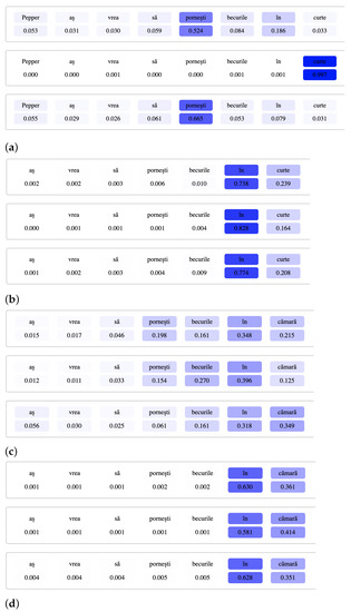 Attention scores on “aș vrea să pornești becurile în …”/“I’d like you to turn on the lights in …” (a) Scenario 0 (b) Scenario 1 (c) Scenario 2 (d) Scenario 3.1 (e) Scenario 3.2 (f) Scenario 3.3.