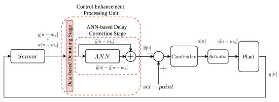 For that reason, the approach proposed in [] has been enhanced in this work by means of a complete and easy tuning data-based enhanced control solution. The new proposed approach will achieve the reduction of the design process complexity and the increment of its scalability [,]. It considers a new denoising approach, the data-based Denoising Stage. It is based on the application of ANNs whose main objective is to denoise the measurements involved in the control considering ideal and noise-corrupted measurements. In addition, this proposal also considers a delay correction stage, the ANN-based Delay Correction. It will correct all the delays affecting the control and actuation signals. Thus, the gain of the controller can be increased and consequently its actuation enhanced. The novelty here is placed in the ANNs training process. They will be trained considering input and output data obtained from open-loop configurations. Therefore, the decoupling of the proposal from mathematical models and specific controllers will be achieved. In other words, the proposed data-based Enhanced Control Strategy will correct the noise-corrupted and delayed measurements by means of the experience obtained from input and output data, neither requiring a highly complex tuning process, nor a deep knowledge of the processes being controlled.