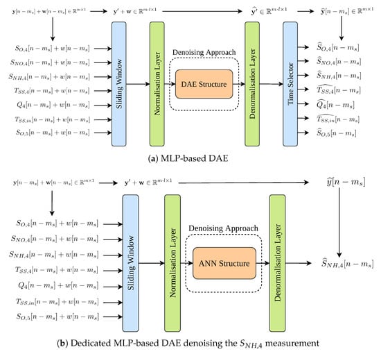 A classical denoising method, a moving average low-pass filter, has been considered to clean the measurements involved in the control in []. It corresponds to a weighted moving average filter which gives more information to the new measurements to decrease the filter delay during long variations of the measured signal. In this case, the filter multiplies the average of the 25% of the new measurements by 0.7 whereas it multiplies by 0.3 the rest of the data []. In such a case, the filter has been able to reduce the noise effects at expense of adding extra delays. Not only this, the denoising performance can be still improved since it does not consider any kind of knowledge about the noise affecting the measurements. For that reason, two different MLP-based denoising architectures have been considered: (i) a MLP-based DAE, and (ii) a Dedicated MLP-based DAE, both considering a Sliding Window (SW) of 4 h (see Figure 4). The former corresponds to the structure shown in Figure 4a whereas the Dedicated MLP-based DAE approach is shown in Figure 4b. Both architectures have a common structure in charge of the data preprocessing tasks: the Sliding Window and the Normalisation Layers. Here, the Sliding Window Layer is adopted to sort the measurements in time and also to preserve the time-correlation between measurements. Its length has been obtained through the process explained in [], where it is shown that the minimum periodicity of input variables should be considered as the minimum length of the SW, here the SW length has been set to 4 h. Then, the sorted measurements are normalised towards zero mean and unit variance in the Normalisation Layer, which is placed previously to the Denoising Approach. This layer is considered to address the heterogeneity of data since the different variables of BSM1 are widely heterogeneous as shown in the saturation values of BSM1 sensors (see Table 1).