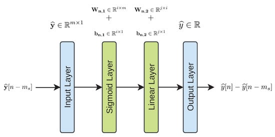 The Delay Correction Stage purpose is to correct the delay introduced not only by the sensors, but also by the actuator by means of predicting the controlled variable of the control strategy, i.e., the . This is performed by means of a simple MLP network which has been designed with the Neural Net Fitting tool of Matlab’s Neural Network Toolbox in order to decrease the complexity of the ANN-based Delay Correction Stage. The MLP architecture is already defined by the same neural network fitting tool. It corresponds to a simple MLP feedforward network with two layers (see Figure 6), where the first one corresponds to a Sigmoid Layer (sigmoid activation function [] (Chapter 1)) while the second one corresponds to a Linear Layer (linear activation function [] (Chapter 1)). The sigmoid layer dimension i can de determined by the designer while the Linear Layer dimension is fixed to 1, , by default.