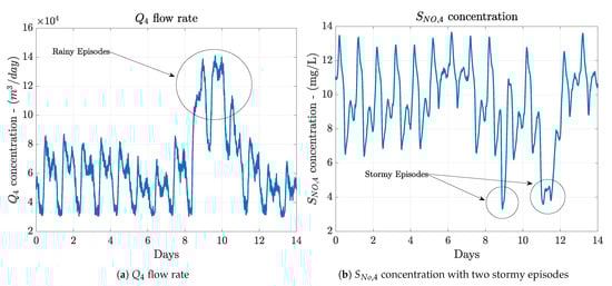 In order to assure a fair comparison, BSM1 implements its own simulation protocol, which consists in the simulation of 14 days of daily influent variations. Depending on these variations, the different control strategies can be tested under different weather conditions. For that purpose, BSM1 implements its own influent profiles as a function of the weather: the dry, rainy and stormy influent profiles [,]. They can be defined as follows,