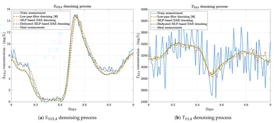 Not only this, extra variables are considered to complement the MLP-based Denoising architectures. They correspond to the and the , both measured in (mg/L). They are two of the variables showing the highest mutual information with respect to the concentration [,,].