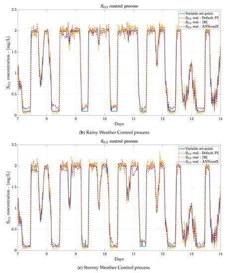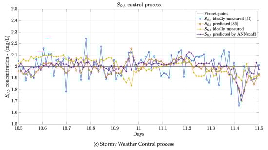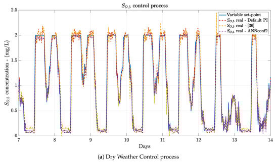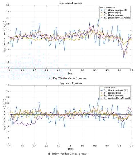 As a summary, our data-based enhanced control strategy, which is implemented by means of ANNs, allows us to improve a control approach by means of (i) decreasing the design process complexity, and (ii) increasing its scalability [,]. The complexity reduction is achieved due to the fact that ANNs do not require a such precise adjustment to the scenario as usual filtering strategies do. Besides, the scalability is increased since ANNs can be applied in different industrial scenarios (not constrained to WWTP ones): the knowledge of the controlled scenario will be directly derived by ANNs if they are trained with proper data [] (Chapters 1, 2, 5 and 17). Results in Section 4 show that our data-based enhanced control approach is able to offer similar and even better results in the control performance than the ones obtained in [], a control approach specially designed and optimised to work in WWTP scenarios.