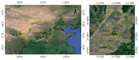 The geographical location and sampling sites of the study area. (a) The location of the study area in the Loess Plateau; (b) The location of the field measured points in the three counties. All points (including red and yellow points) are field measured points, and the red points are sampling sites for data assimilation.