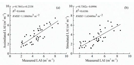 Linear regression analysis with measured LAI. (a) Assimilated LAI; (b) Simulated LAI.