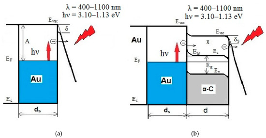 In Figure 1 and further, we used the following designations and values: spectral range was λ = 400–1100 nm; the energy of nonequilibrium “hot” electrons corresponded to the indicated wavelength range −3.10–1.13 eV; EF was the Fermi level; EVAC was the vacuum level; Eg was the width of the forbidden zone in the DLC; EC and EV were the energy levels corresponding to the bottom of the conduction band and the top of the valence band in the DLC; χ was the electronic affinity; EB was the height of the potential barrier at the metal–semiconductor interface; δ = (e3βF)1/2 ≈1.2 (F(V/nm))1/2 was the decrease in the height of the potential barrier in a strong electrostatic field at the metal–vacuum interface (see Figure 1a) taking into account the Schottky effect and δs for a semiconductor film with reduced field strength F in the film by a factor of ε; ε was the dielectric constant of the film material, β was the form factor of strengthening the electrostatic field due to the curvature of the surface at the semiconductor–vacuum interface; work function A = EVAC − EF; the shape of the potential barrier at the metal–vacuum interface was determined by the ratio (eFζ − e2/4ζ), where F is the strength of the electro-static field, e is the electron charge, ζ is the distance from the interface; ds was the thickness of the skin layer (on the order of several tens of nanometers for noble metals); and d was the thickness of the diamond-like nanofilm (10–30 nm).