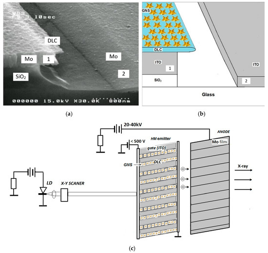 Modification of the emission structure [18] (see Figure 2a) by replacing the existing emitter with an HM structure and manufacturing electrodes from a light-transmitting indium tin oxide (ITO) alloy (see Figure 2b) made it possible to implement the array X-ray emitter design (see Figure 2c) for DCT systems. The performance of the device was ensured by the use of a high-speed laser scanner.