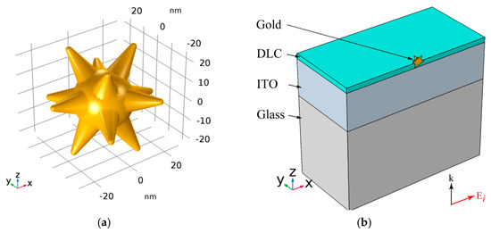 To describe the bulk dielectric functions of materials (gold [40], DLC [41], ITO [42]), the interpolated tabular data given in the above works were used. The dielectric constant of the glass substrate was taken to be εr = 2.25. The geometrical parameters of the GNS, which were used in the design of the computational model, were taken for certainty in accordance with the GNS, synthesized and experimentally investigated in ref [43]. Thermo-optical properties of such GNS have been studied theoretically earlier [34]. The results obtained, in particular, made it possible to explain the experimentally observed threshold nature of their photomodification when irradiated with nanosecond laser pulses. Therefore, the geometrical model of the GNS was a sphere 22 nm in diameter with twelve S-cone spikes with a height and base diameter of 10 nm, and a tip curvature radius of 1.5 nm.