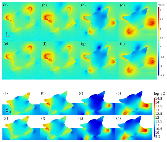 2D maps of normalized electric field (upper panel) and specific radiation absorption power Q under an irradiation field of intensity I0 = 1 W/cm2 (lower panel) in an HM slice at 584 nm (a,e); 634 nm (d,f); 808 (c,g); 970 nm (d,h) calculated for bulk (a–d) and size-corrected (e–h) dielectric function of spikes.