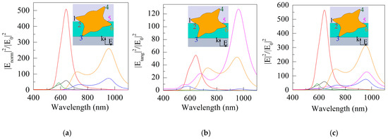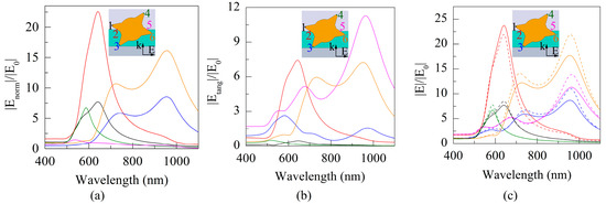 Spectral curves for the squares of the modules of normal |Enormal| (a), tangential |Etang| (b) field components and total field (c) normalized to the square of the modulus of the irradiating field |E0| at six specified points on the GNS surface. The designations of points and curves are the same as in Figure 6.