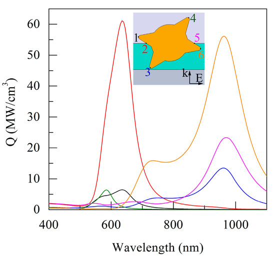 The results of calculation of the specific power absorption Q at the selected points of the GNS are presented in Figure 7. It is possible to note the reduced values of Q at the tips of the GNS spikes, which are predominantly in a vacuum compared to other GNS spikes immersed in the DLC. This difference in Q value can reach 3–9-fold. It is characteristic that the spectral curves Q for each of the points are predominantly single-peaked.