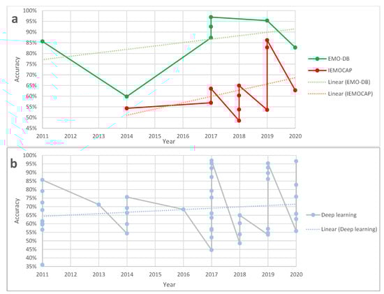 Traditionally SER used to follow the steps of automatic speech recognition (ASR), and methods based on HMMS, GMMs, and SVMs were widespread [5,6,13,14,15,16,17]. Those approaches needed lots of feature engineering and any changes in the features usually required restructuring the entire architecture of the method. However, lately, by the development of deep learning tools and processes, solutions for SER can be changed as well. There is a lot of effort and research on employing these algorithms to recognize emotions from the speech [18,19,20,21,22,23,24,25,26,27]. In addition to deep learning, more recently, along with improvements in recurrent neural networks and the use of long short-term memory (LSTM) networks, autoencoders, and generative adversarial models, there has been a wave of studies on SER using these techniques [28,29,30,31,32,33] to solve the problem.