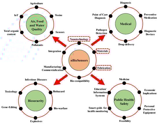 The field of research dealing with advancement in nano-biosensors is vast and comprises of a variety of multidisciplinary aspects. The primary applications of nano-biosensors can be broadly divided into the following fields: monitoring of air, food, and water quality, medical research, biosecurity, and public health and safety. These fields of research can be further subdivided into categories. For example, research dealing with air monitoring comprises of studies and advancements in sensor technology, which can be utilized for detecting levels of carcinogenic VOCs and other air pollutants. Similarly, research in point-of-care diagnosis have been fundamental in propelling advancements in the field of medical research. Additionally, development of more advanced PPEs have been crucial in the fight against infectious diseases, such as the ongoing COVID-19 pandemic. Therefore, one must appreciate the sheer vastness of the field of nano-biosensors. As highlighted in the figure, we aim at providing a broad description of certain aspects of nano-biosensors, including the concepts of nanoscale science which is fundamental to the realization of such biosensors and the materials which have been widely used to fabricate such nanodevices, along with numerous examples from the literature.